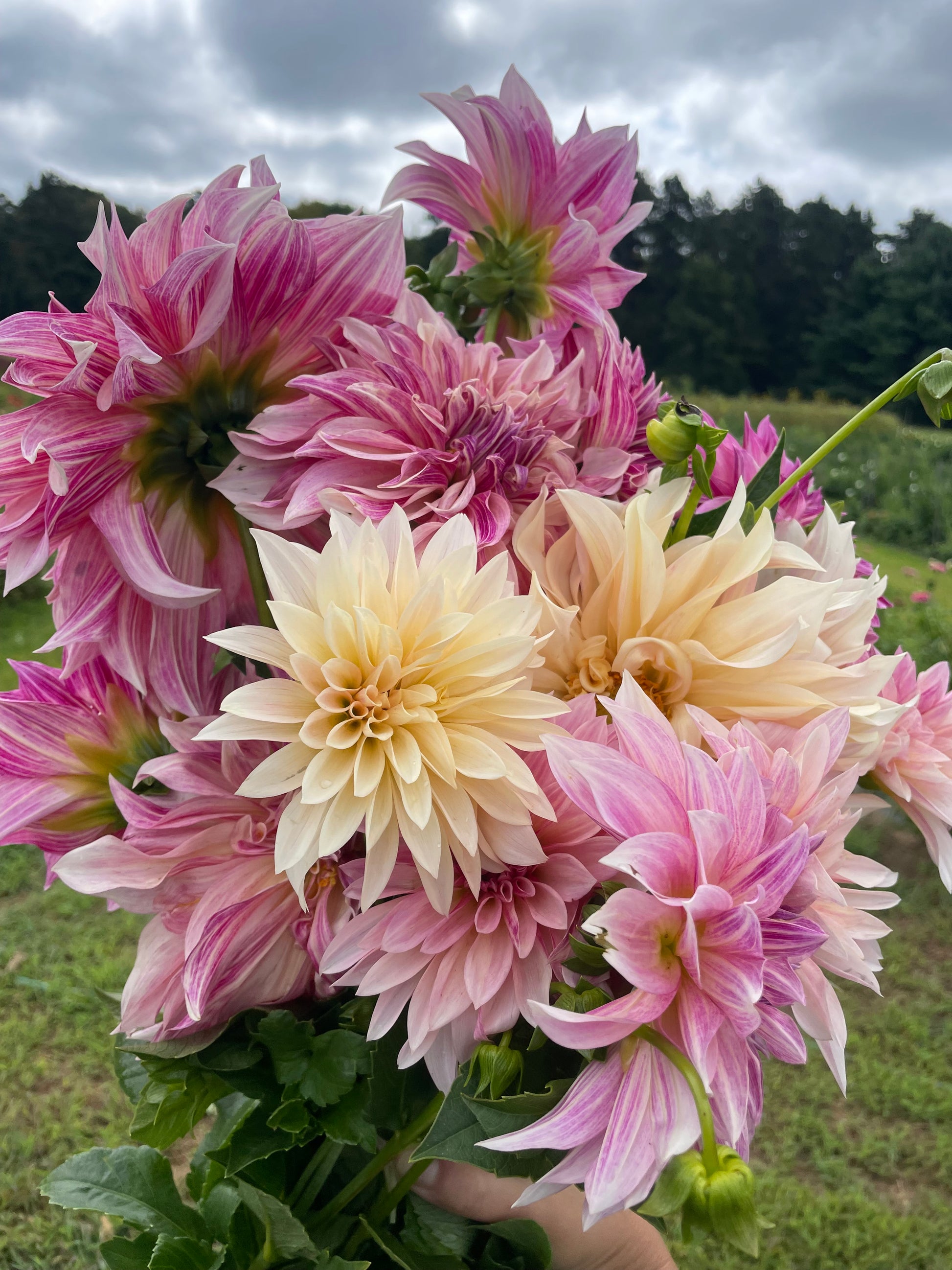 This class teaches you how to create a beautiful arrangment with a mix of dahlias, folliage, and other fall blooms with techniques that can be used for weddings, showers, birthdays, and many other events! All materials will be supplied. We will be using a mix of different flowers grown on our flower farm in Richmond Rhode Island. You can choose different colors and flowers of your choice from the floral bar to create your arrangement as well as from our flower fields. Looking forward to a fun and Fall festive centerpiece making class!