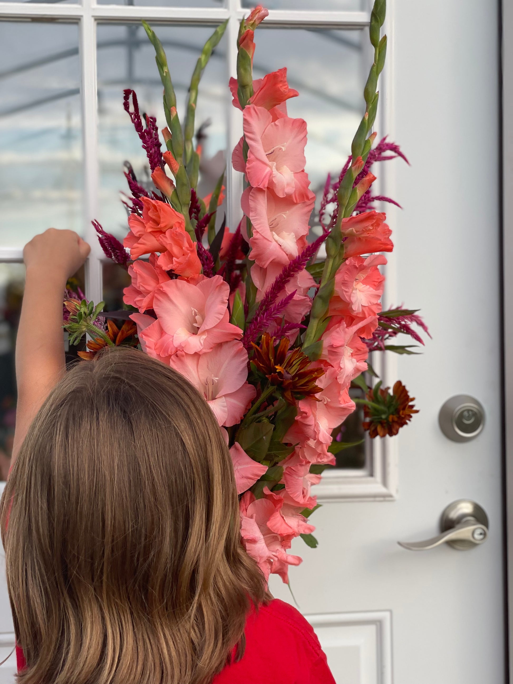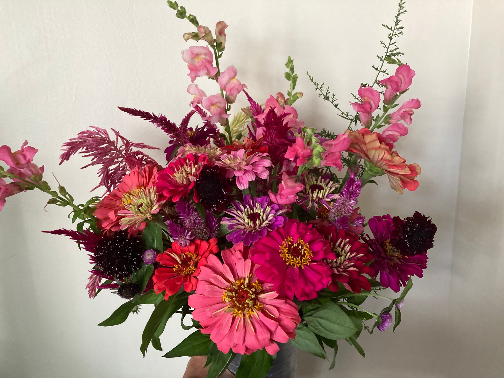The pictures below are just a few examples, but we have so many variations depending what flowers are at their best that week. Flower varieties for the pink hues bouquet can include but not limited to different pink zinnias, dahlias, amaranth, celosia, snapdragons, lisianthus, and more!