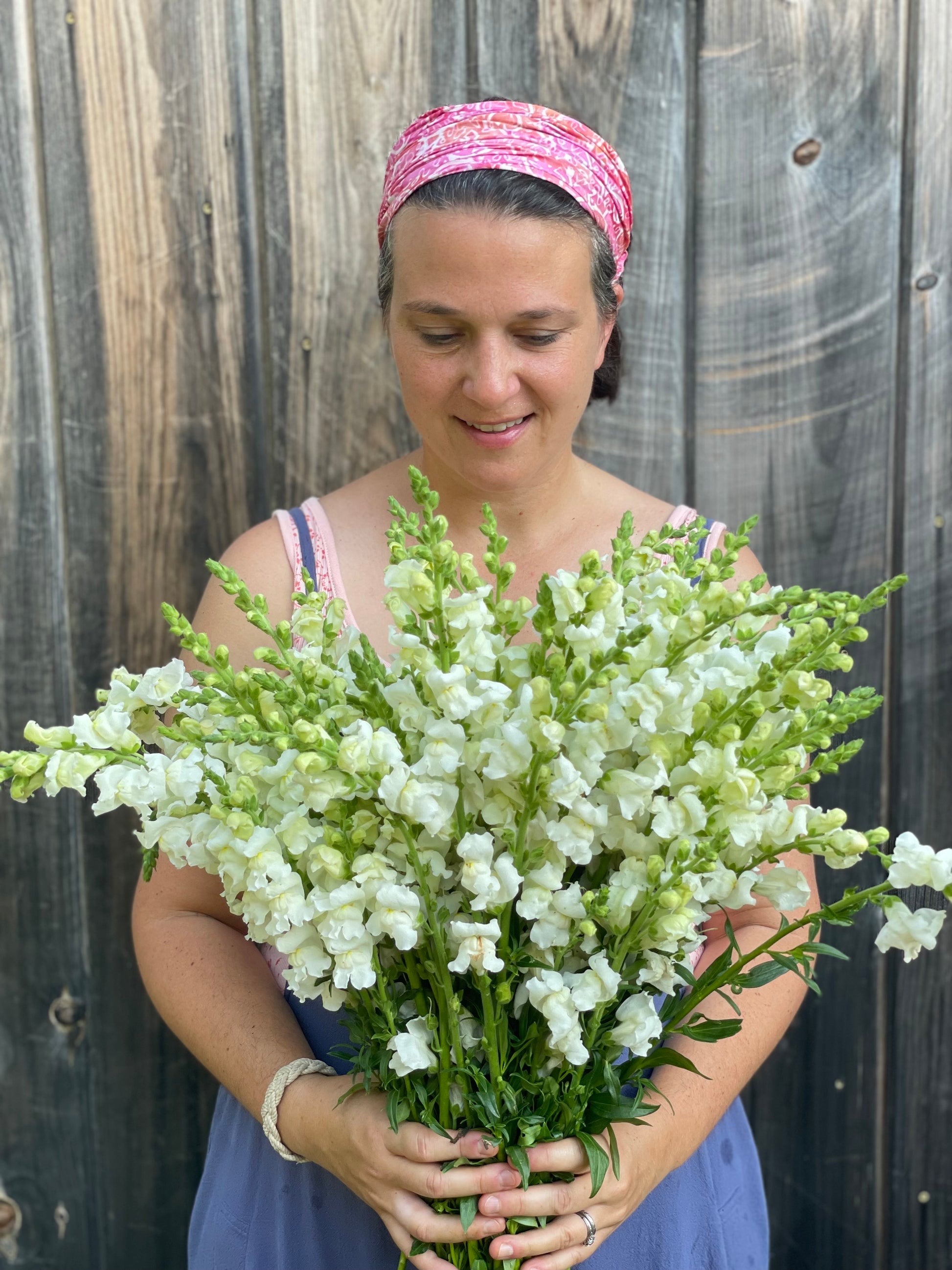 White snapdragons with a hint of yellow at the mouth of the blooms. These snapdragons are beautiful in bouquets and arrangements. We love using this color for weddings.