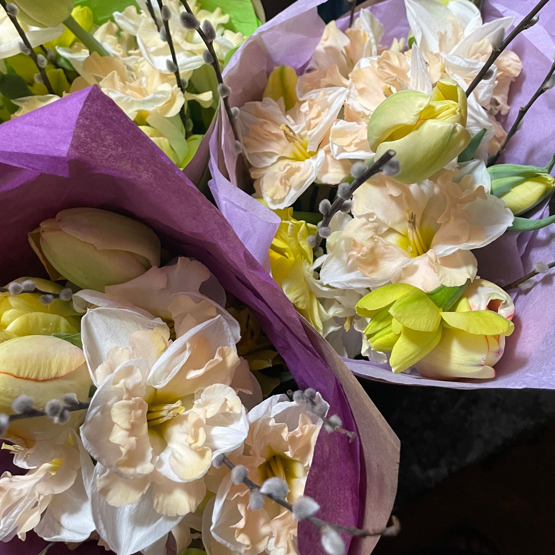We love all of the many different kinds and colors that flowers have to offer! There are so many different varieties in this world and in the spring, tulips, daffodils, lilacs, peonies, and anemones will make you smile! The picture is just an example of one type of springtime flower bouquet, but we offer many different variations of this with the ever changing flowers blooming on our farm. Currently, this week the daffodils and tulips varieties are in!